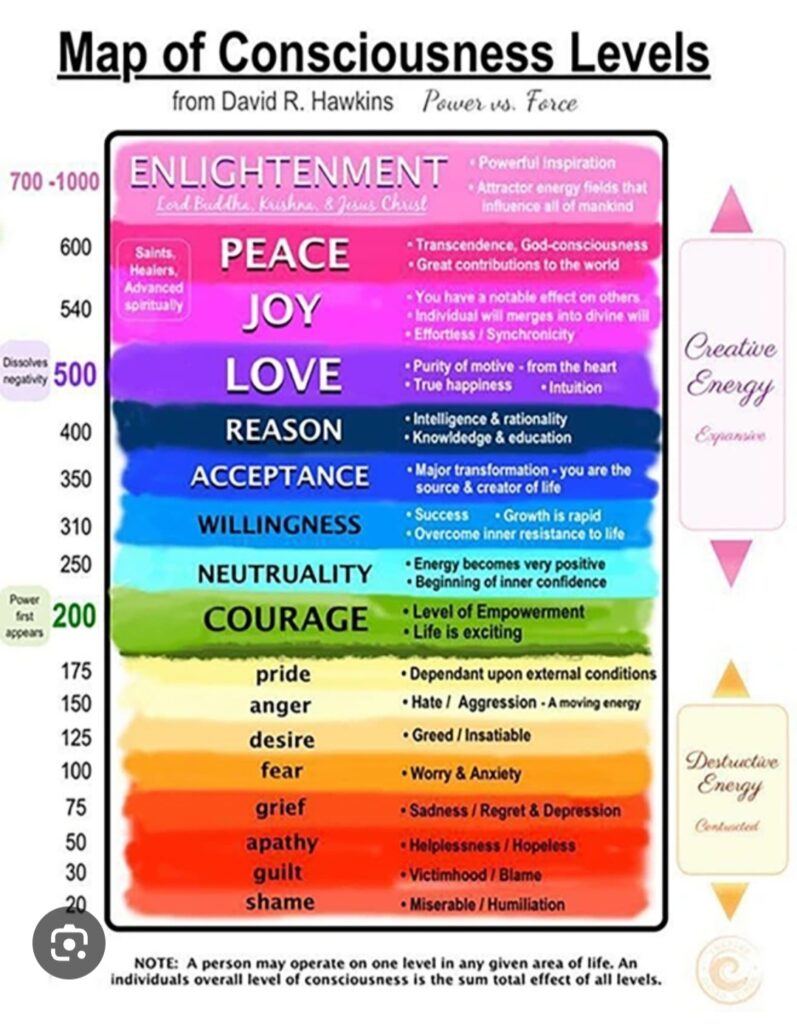 „Map of Consciousness“ (Sąmoningumo lygio žemėlapis) – tai Dr. David R. Hawkins sukurta sistema, kuri matuoja žmogaus sąmoningumo lygius nuo žemiausių emocijų iki aukščiausių. Ši skalė prasideda nuo 20 (gėda) ir kyla iki 1000 (nušvitimas). Kiekvienas lygis atitinka tam tikrą vidinę vibraciją, kuri gali turėti įtakos žmogaus emocijoms, mintims ir veiksmams. Hawkins teigia, kad aukštesni sąmoningumo lygiai, tokie kaip meilė, džiaugsmas ir taika, atveria žmoguje daugiau harmonijos ir šviesos, o žemesni lygiai, kaip baimė, pyktis ir kaltė, dažniau sukelia vidinį konfliktą ir kančią.